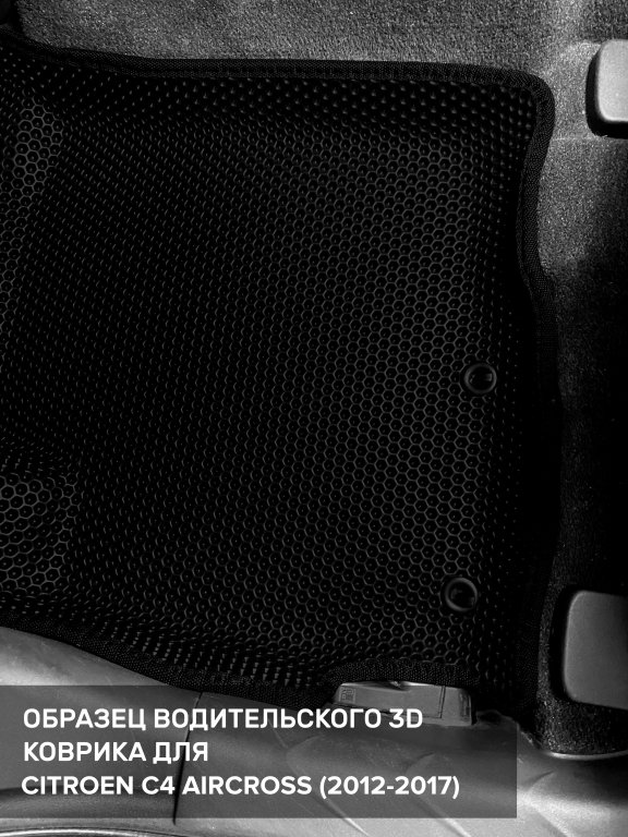 Автомобильные 3д коврики для Citroen C4 Aircross (2012-2017) в салон авто и багажник сделаны из инновационного полимерного материала EVA, изысканная структура в виде ячеек не дает воде, пыли и снегу разлетаться по салону машины и багажнику. 3д коврики зафиксированы на полу определенными клипсами, соответствующими Citroen C4 Aircross (2012-2017), и не двигаются в процессе езды.