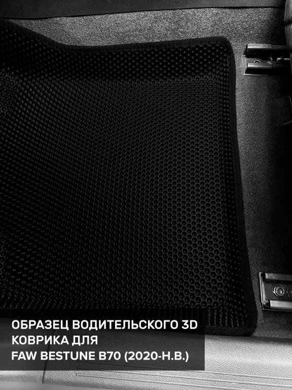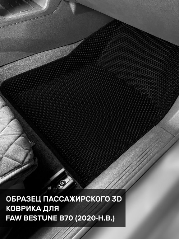 Автомобильные 3д коврики для FAW Bestune B70 (2020-н.в.) в салон авто и багажник сделаны из инновационного полимерного материала EVA, изысканная структура в виде ячеек не дает воде, пыли и снегу разлетаться по салону машины и багажнику. 3д коврики зафиксированы на полу определенными клипсами, соответствующими FAW Bestune B70 (2020-н.в.), и не двигаются в процессе езды.
