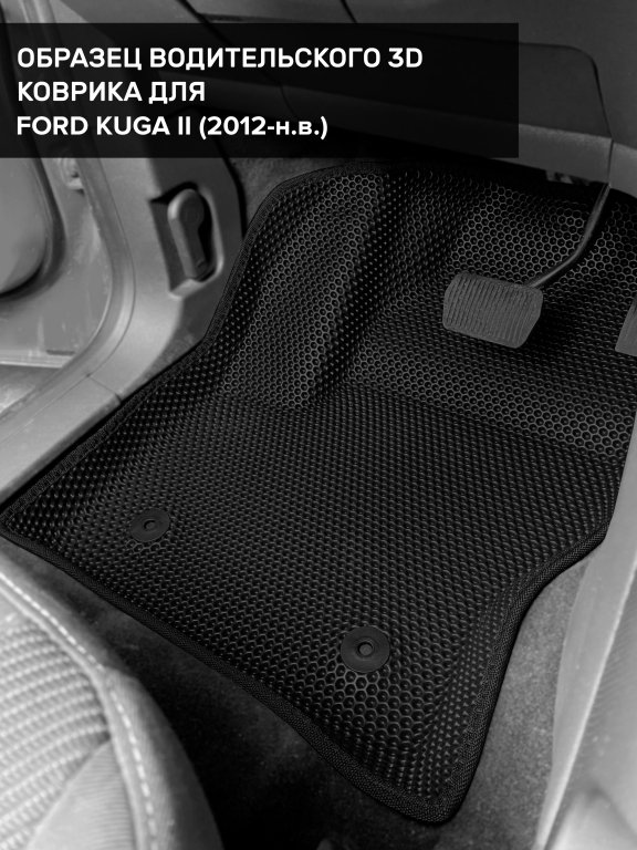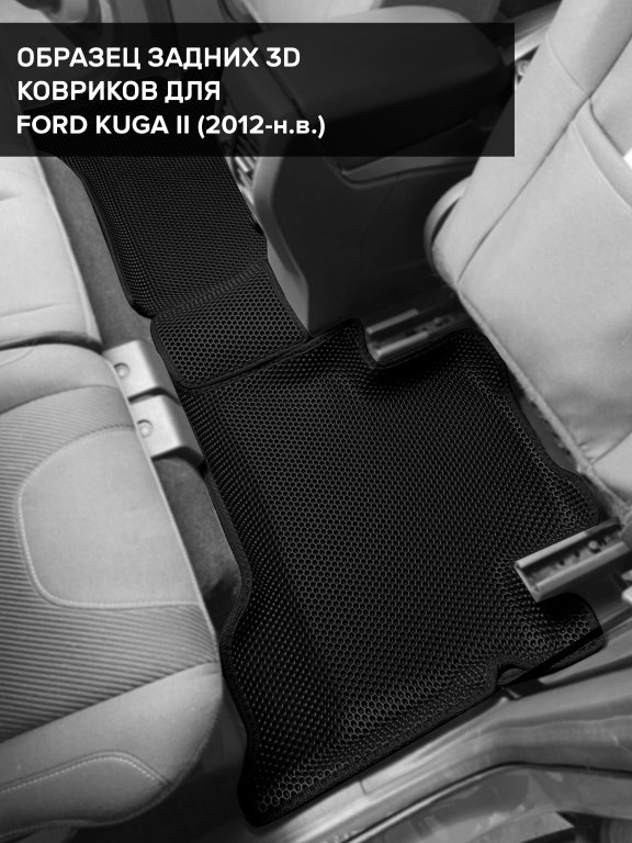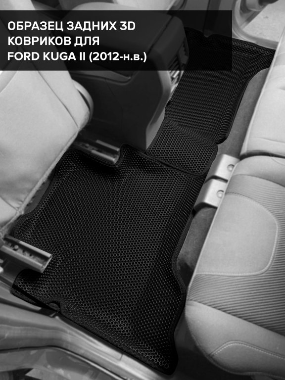 Автомобильные 3д коврики для Ford Kuga II (2012-н.в.) в салон авто и багажник сделаны из инновационного полимерного материала EVA, изысканная структура в виде ячеек не дает воде, пыли и снегу разлетаться по салону машины и багажнику. 3д коврики зафиксированы на полу определенными клипсами, соответствующими Ford Kuga II (2012-н.в.), и не двигаются в процессе езды.