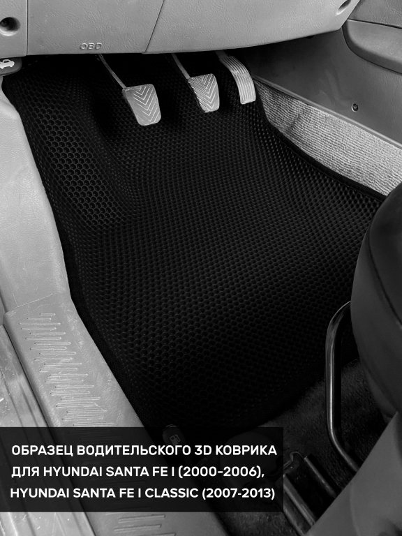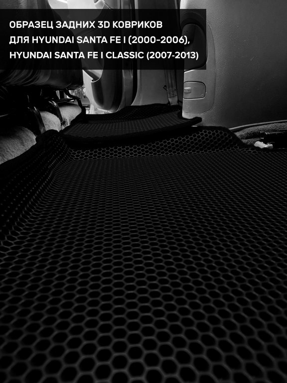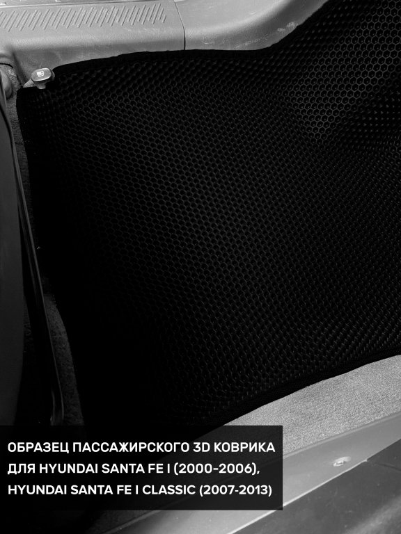 Автомобильные 3д коврики для Hyundai Santa Fe I Classic (2007-2013) в салон авто и багажник сделаны из инновационного полимерного материала EVA, изысканная структура в виде ячеек не дает воде, пыли и снегу разлетаться по салону машины и багажнику. 3д коврики зафиксированы на полу определенными клипсами, соответствующими Hyundai Santa Fe I Classic (2007-2013), и не двигаются в процессе езды.
