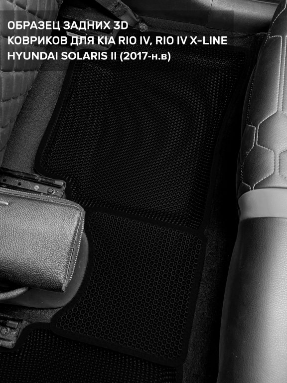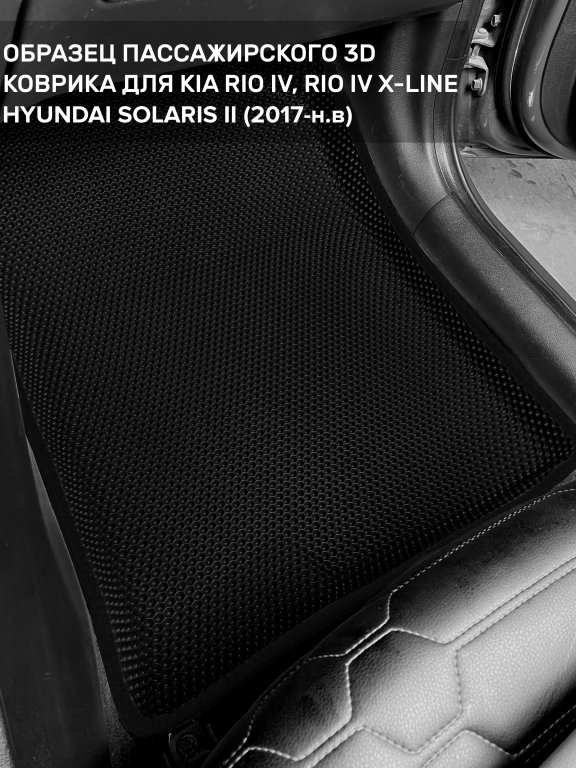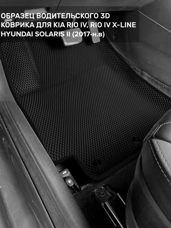 Автомобильные 3д коврики для Kia Rio IV (2017-н.в.) в салон авто и багажник сделаны из инновационного полимерного материала EVA, изысканная структура в виде ячеек не дает воде, пыли и снегу разлетаться по салону машины и багажнику. 3д коврики зафиксированы на полу определенными клипсами, соответствующими Kia Rio IV (2017-н.в.), и не двигаются в процессе езды.
