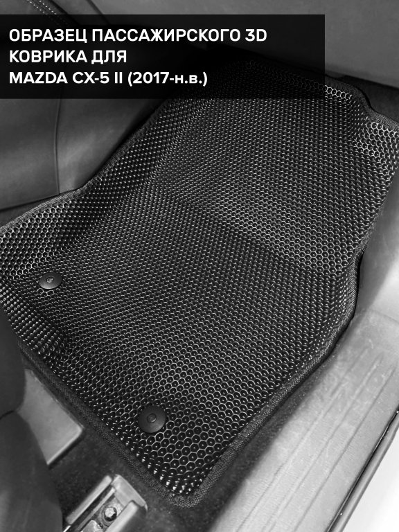 Автомобильные 3д коврики для Mazda CX-5 II (2017-н.в.) в салон авто и багажник сделаны из инновационного полимерного материала EVA, изысканная структура в виде ячеек не дает воде, пыли и снегу разлетаться по салону машины и багажнику. 3д коврики зафиксированы на полу определенными клипсами, соответствующими Mazda CX-5 II (2017-н.в.), и не двигаются в процессе езды.