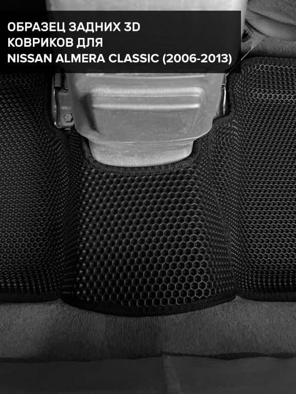 Автомобильные 3д коврики для Nissan Almera Classic (2006-2013) в салон авто и багажник сделаны из инновационного полимерного материала EVA, изысканная структура в виде ячеек не дает воде, пыли и снегу разлетаться по салону машины и багажнику. 3д коврики зафиксированы на полу определенными клипсами, соответствующими Nissan Almera Classic (2006-2013), и не двигаются в процессе езды.