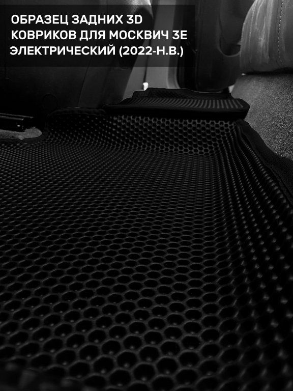 Автомобильные 3д коврики для Москвич 3е (2022-н.в.) в салон авто и багажник сделаны из инновационного полимерного материала EVA, изысканная структура в виде ячеек не дает воде, пыли и снегу разлетаться по салону машины и багажнику. 3д коврики зафиксированы на полу определенными клипсами, соответствующими Москвич 3е (2022-н.в.), и не двигаются в процессе езды.