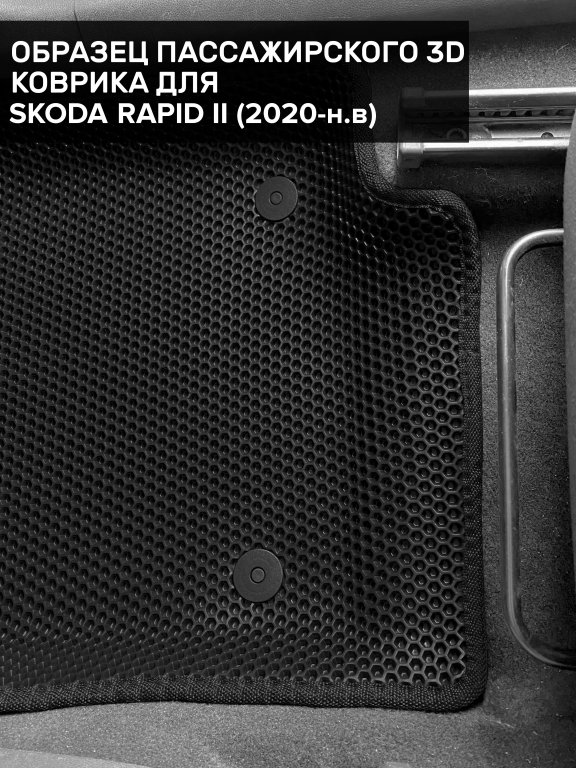 Автомобильные 3д коврики для Skoda Rapid II (2020-н.в.) в салон авто и багажник сделаны из инновационного полимерного материала EVA, изысканная структура в виде ячеек не дает воде, пыли и снегу разлетаться по салону машины и багажнику. 3д коврики зафиксированы на полу определенными клипсами, соответствующими Skoda Rapid II (2020-н.в.), и не двигаются в процессе езды.