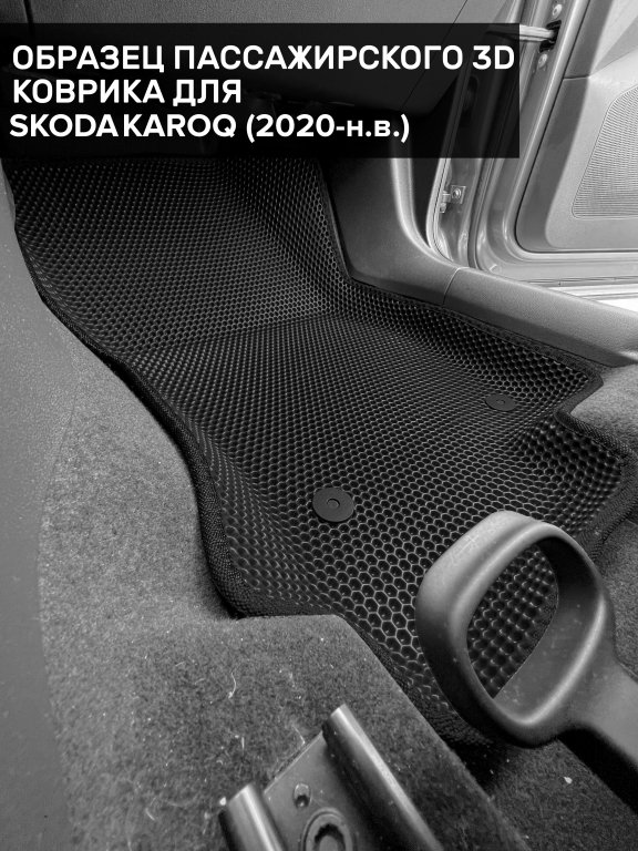 Автомобильные 3д коврики для Skoda Karoq (2020-н.в.) в салон авто и багажник сделаны из инновационного полимерного материала EVA, изысканная структура в виде ячеек не дает воде, пыли и снегу разлетаться по салону машины и багажнику. 3д коврики зафиксированы на полу определенными клипсами, соответствующими Skoda Karoq (2020-н.в.), и не двигаются в процессе езды.