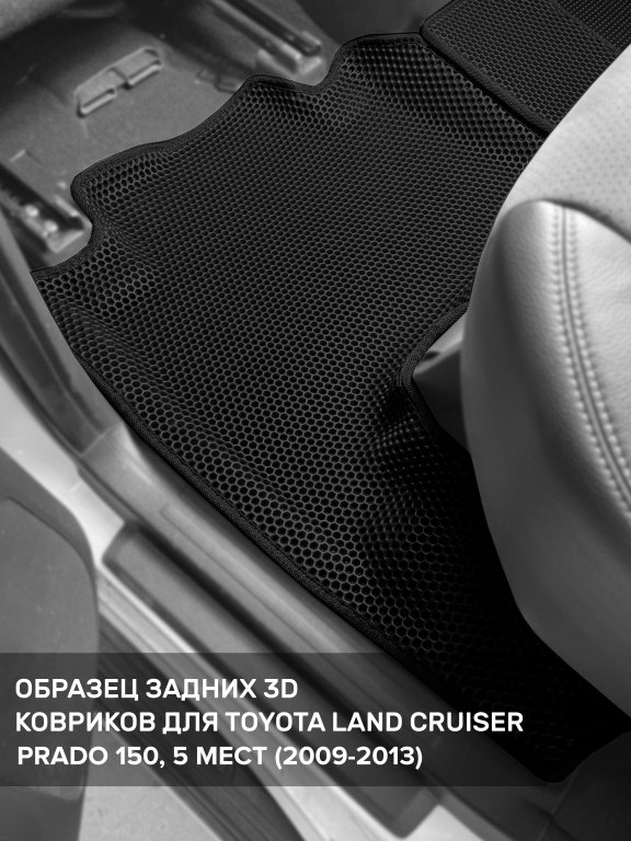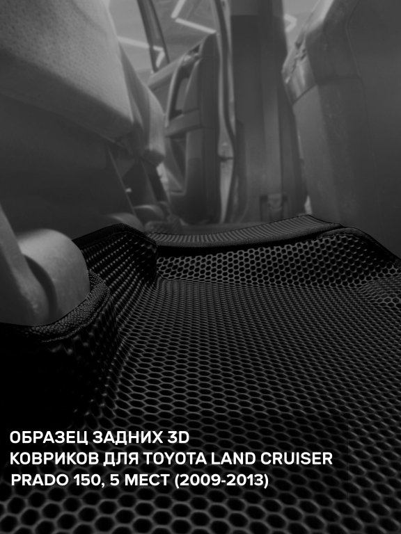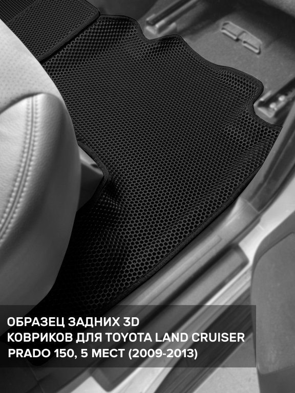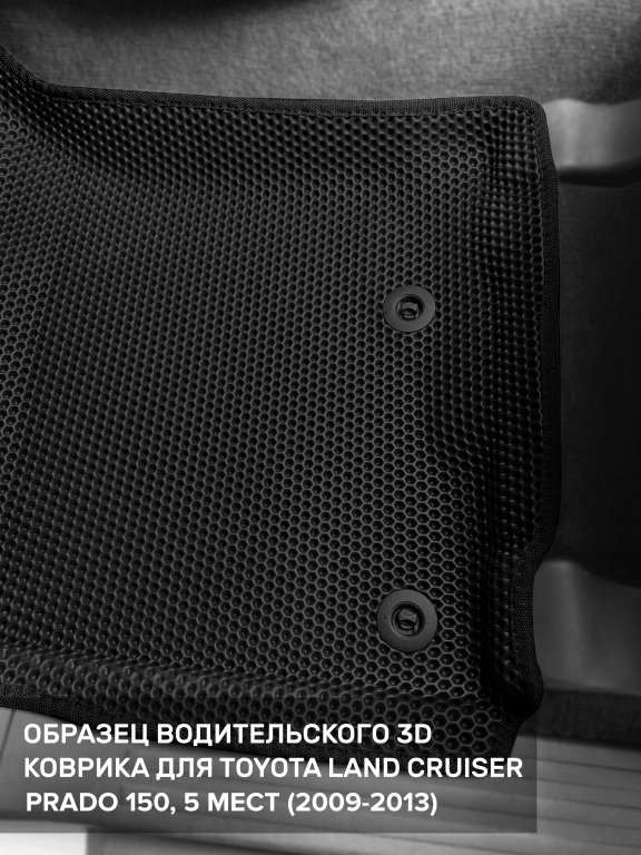Автомобильные 3д коврики для Toyota Land Cruiser Prado 150 (2009-н.в.) в салон авто и багажник сделаны из инновационного полимерного материала EVA, изысканная структура в виде ячеек не дает воде, пыли и снегу разлетаться по салону машины и багажнику. 3д коврики зафиксированы на полу определенными клипсами, соответствующими Toyota Land Cruiser Prado 150 (2009-н.в.), и не двигаются в процессе езды.